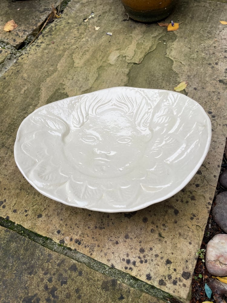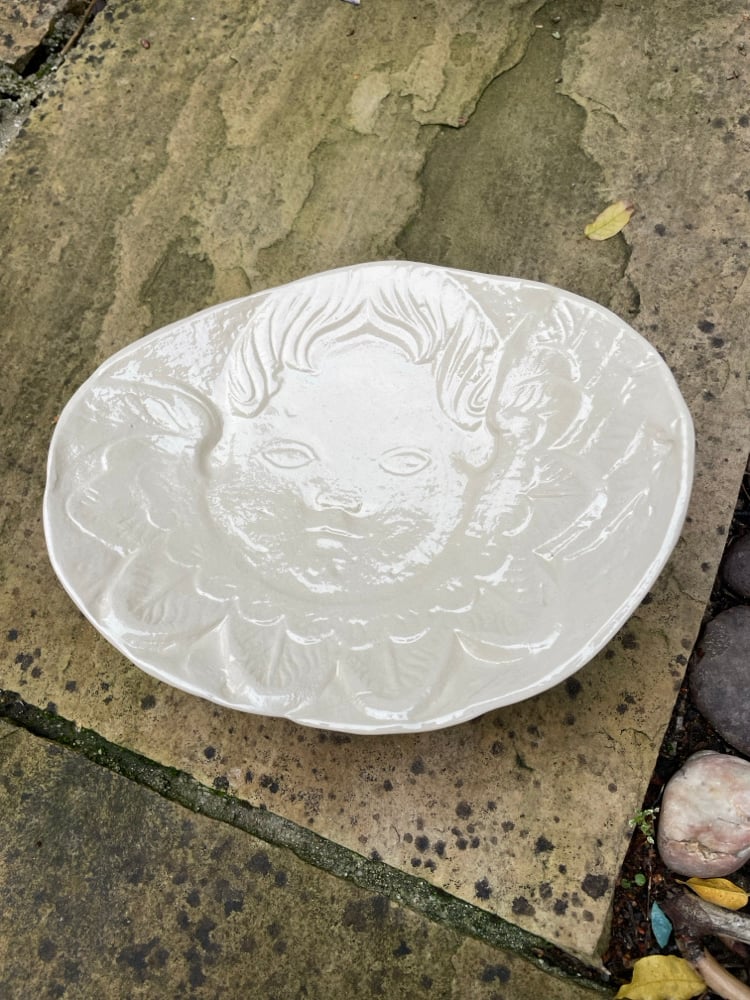 Raised bowl with cherub - impression taken from a grave in Yoxford. Measures 20cm x 15cm x 10cm high. White ceramic.